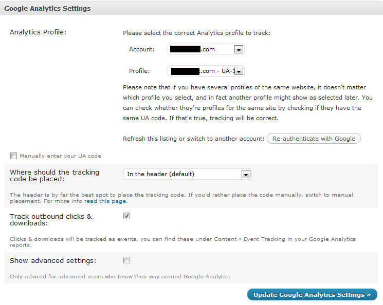 Then you need to authenticate your account with Google Analytics and choose your other settings. You can decide whether you want the Analytics code to be inserted automatically into the header (recommended unless you’re an advanced user).